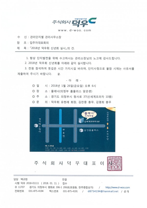 ■ 2018년 덕우회 신년회를 개최합니다. 페이지 정보 작성자 최고관리자 (115.♡.139.242) 작성일18-01-11 13:06 조회9,534회 댓글0건 관련링크 이전글 다음글 목록 본문 전원 참석하시어 뜻깊은 시간을 가졌으면 좋겠습니다.단지사정으로 불참시에는 사유서를 제출하여 주시기 바랍니다. 댓글목록 등록된 댓글이 없습니다. 이전글 다음글 목록