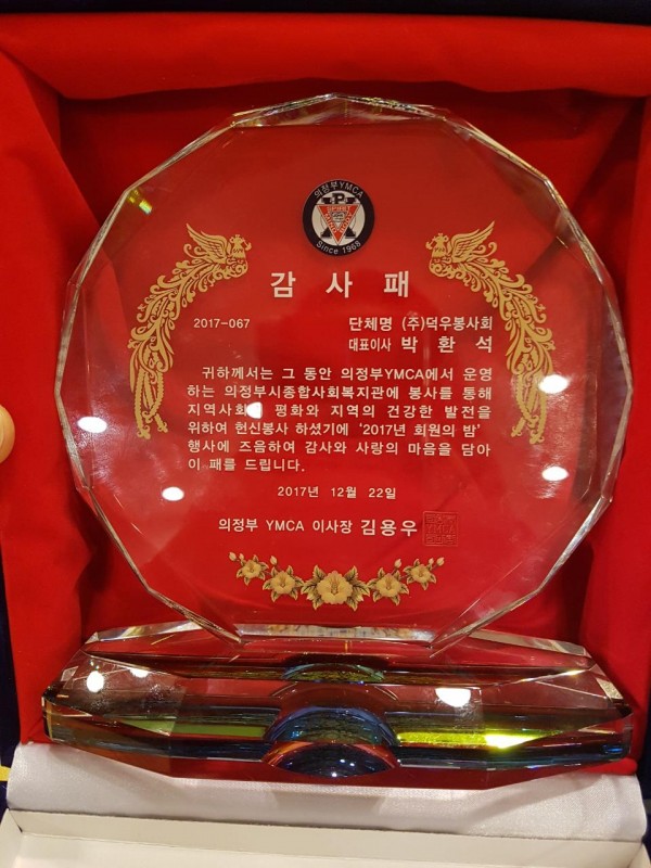 ◆ 덕우 봉사회 '의정부 YMCA' 감사패 수상